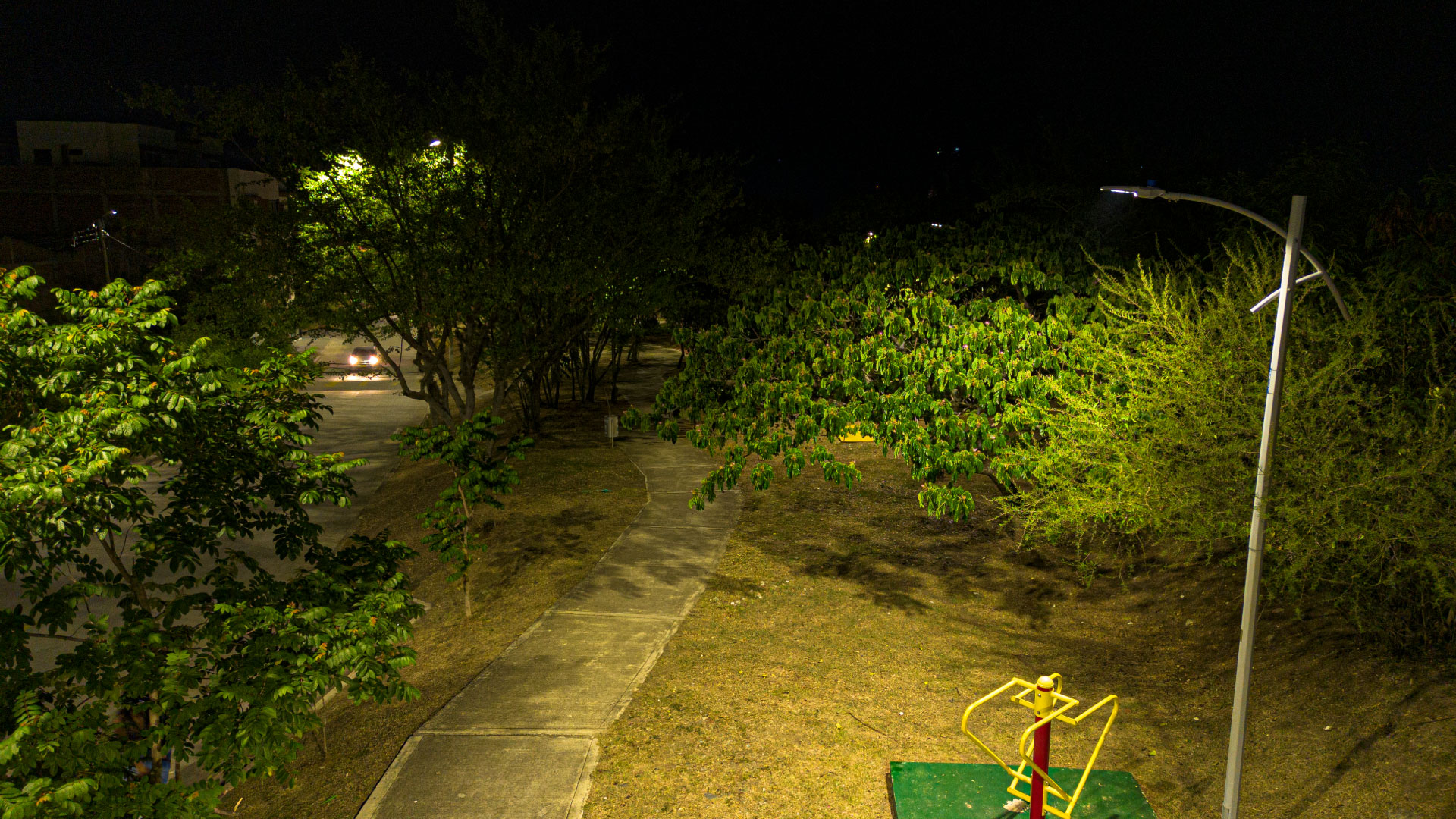 El proyecto en la imagen muestra una iluminación vial en una calle urbana rodeada de árboles, donde la instalación de farolas LED ha transformado la vía en un espacio bien iluminado y acogedor para residentes y visitantes. Esta implementación no solo destaca la belleza de la vegetación que decora la calle, sino que también garantiza la seguridad y comodidad de quienes transitan por el área.